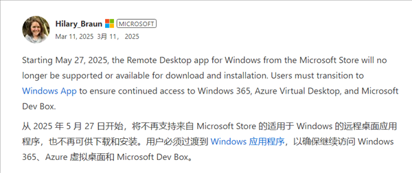 3月11日消息,微軟宣布將在2025年5月27日關(guān)閉并從Microsoft Store中移除Windows遠(yuǎn)程桌面應(yīng)用程序,依賴該應(yīng)用的用戶需要盡快轉(zhuǎn)向新的解決方案,以繼續(xù)使用相關(guān)服務(wù)。