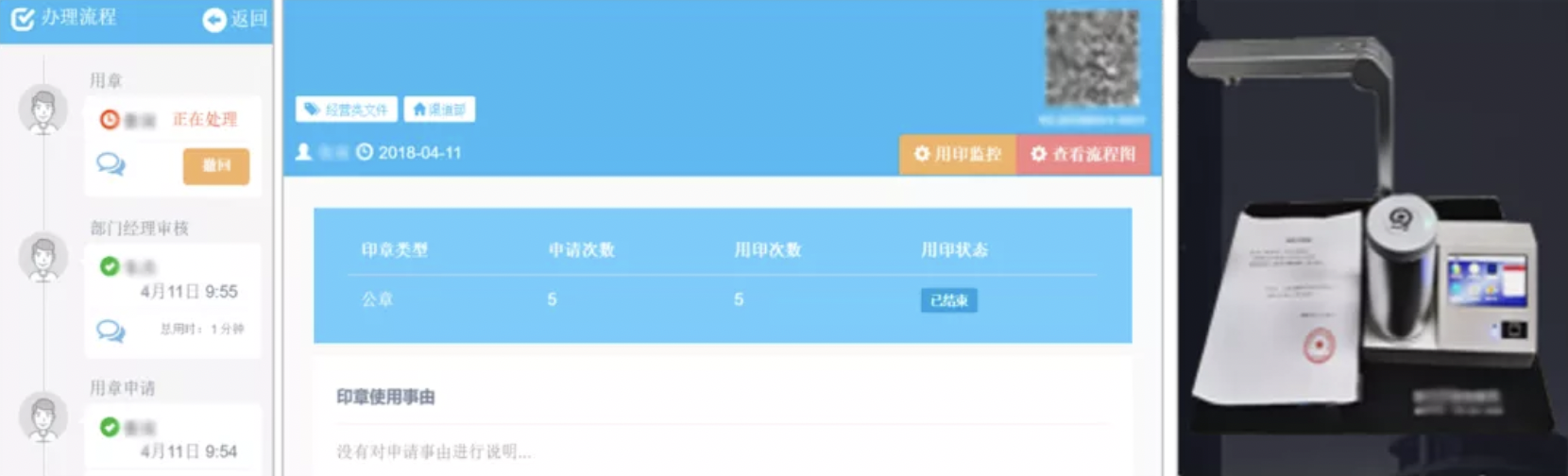 在用印過(guò)程中,平臺(tái)全程記錄、留痕留底,可以責(zé)任到人,降低違規(guī)用印風(fēng)險(xiǎn),讓印章使用更安全,管理更智慧!