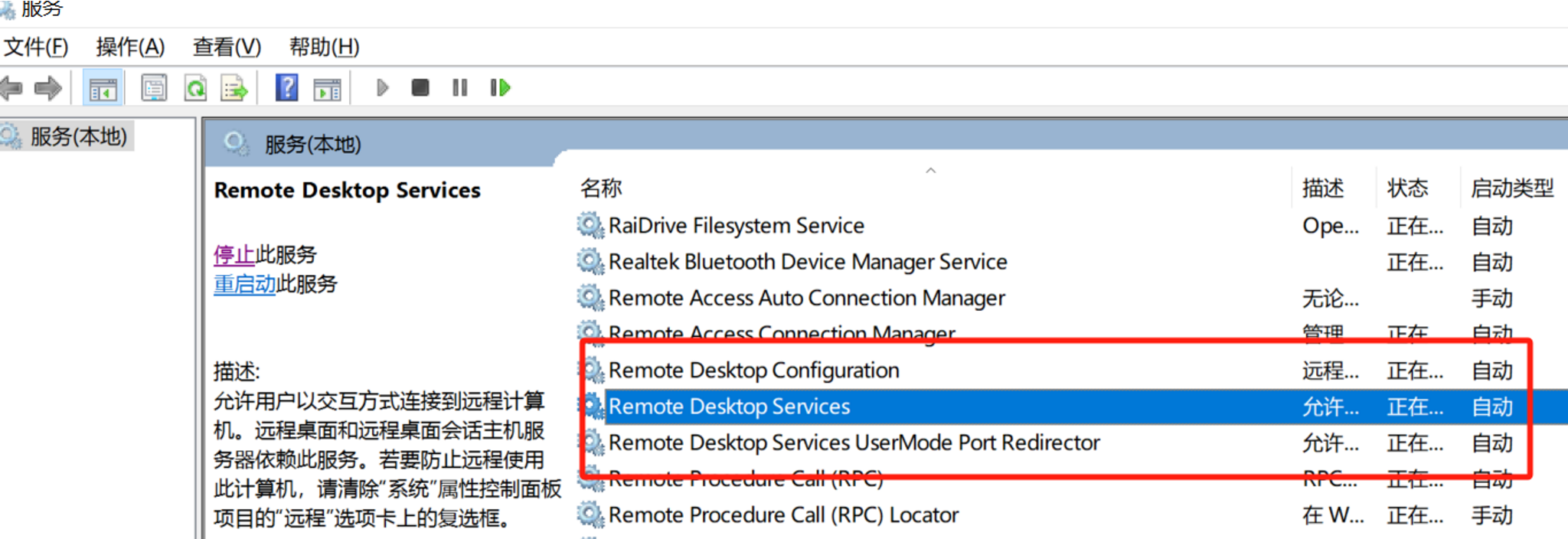 那么有沒有不重啟系統(tǒng)就能使其生效的辦法呢?有的,通過重啟遠(yuǎn)程桌面服務(wù)的形式可以不用重啟系統(tǒng)就使配置生效。與遠(yuǎn)程桌面相關(guān)的服務(wù)有: